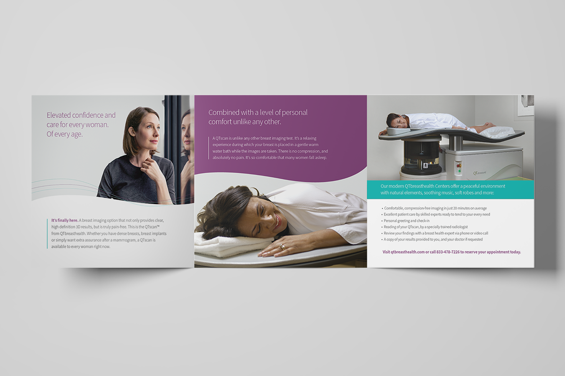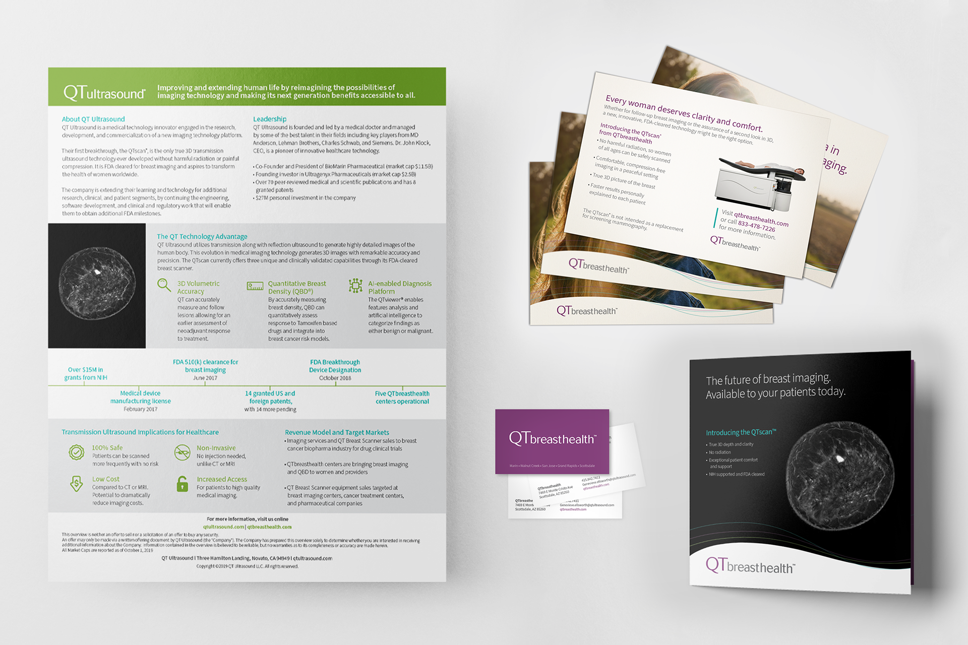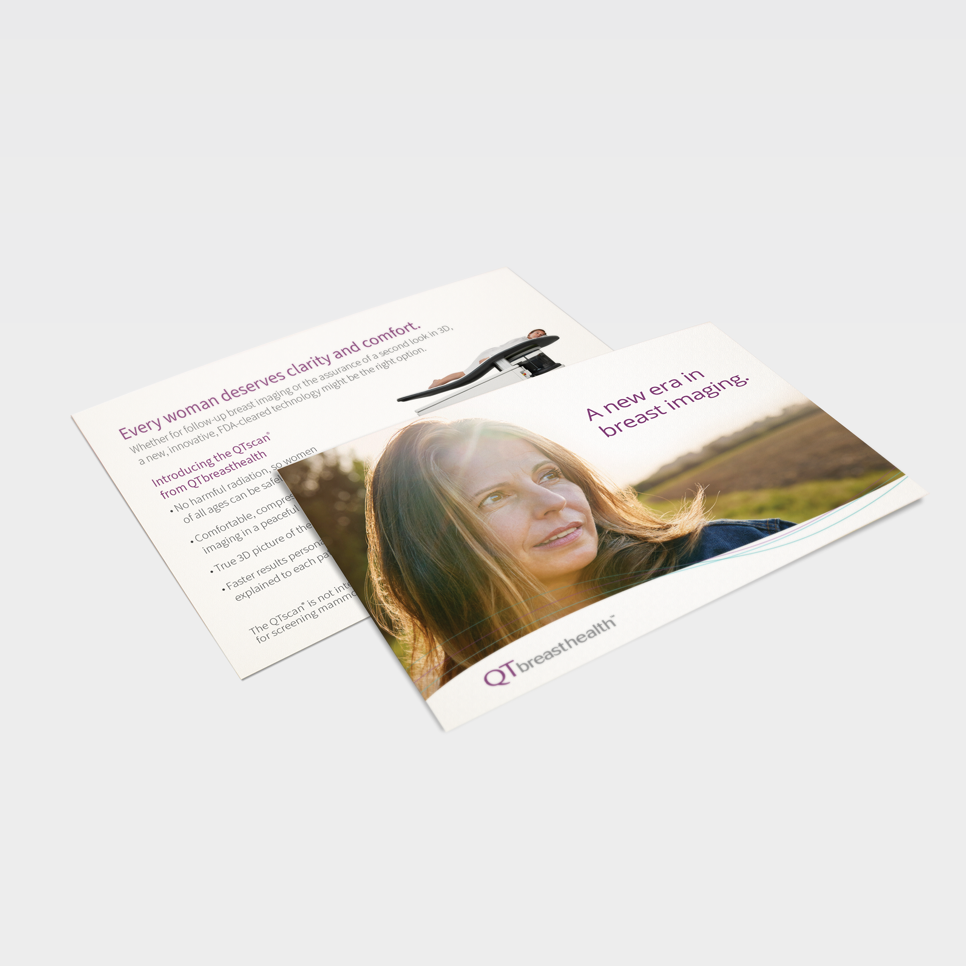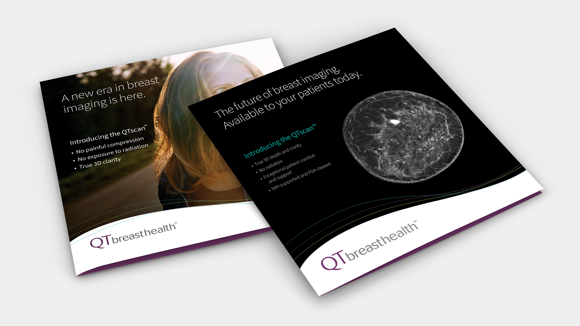 Two trifold brochures were created for two distinct audiences. One focused on patients, highlighting the benefits of choosing QTbreasthealth’s services. The other targeted doctors and specialists, explaining the technology behind QTbreasthealth and how it works.