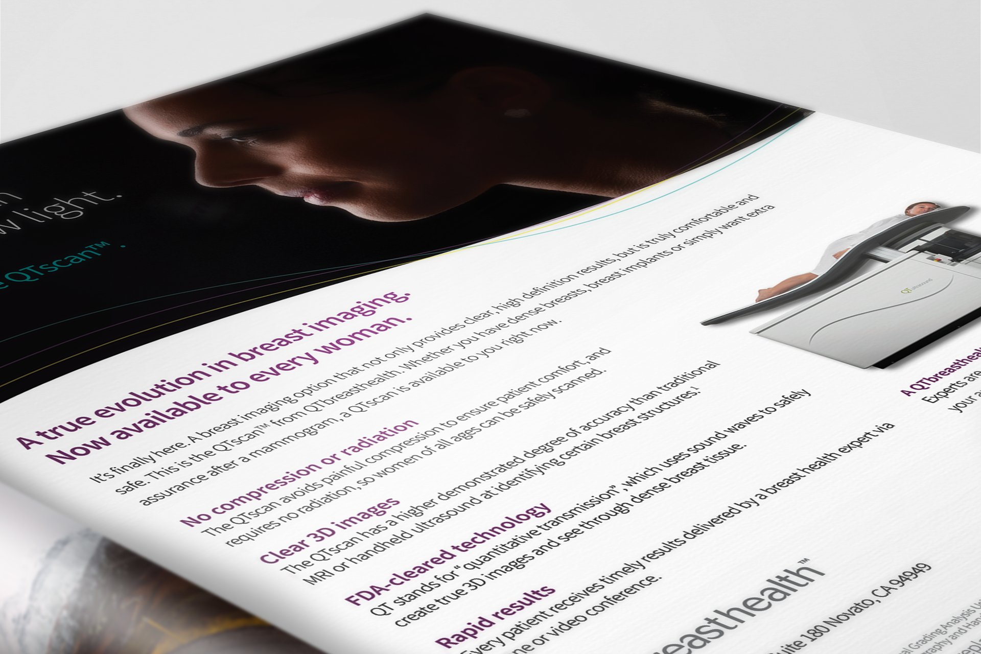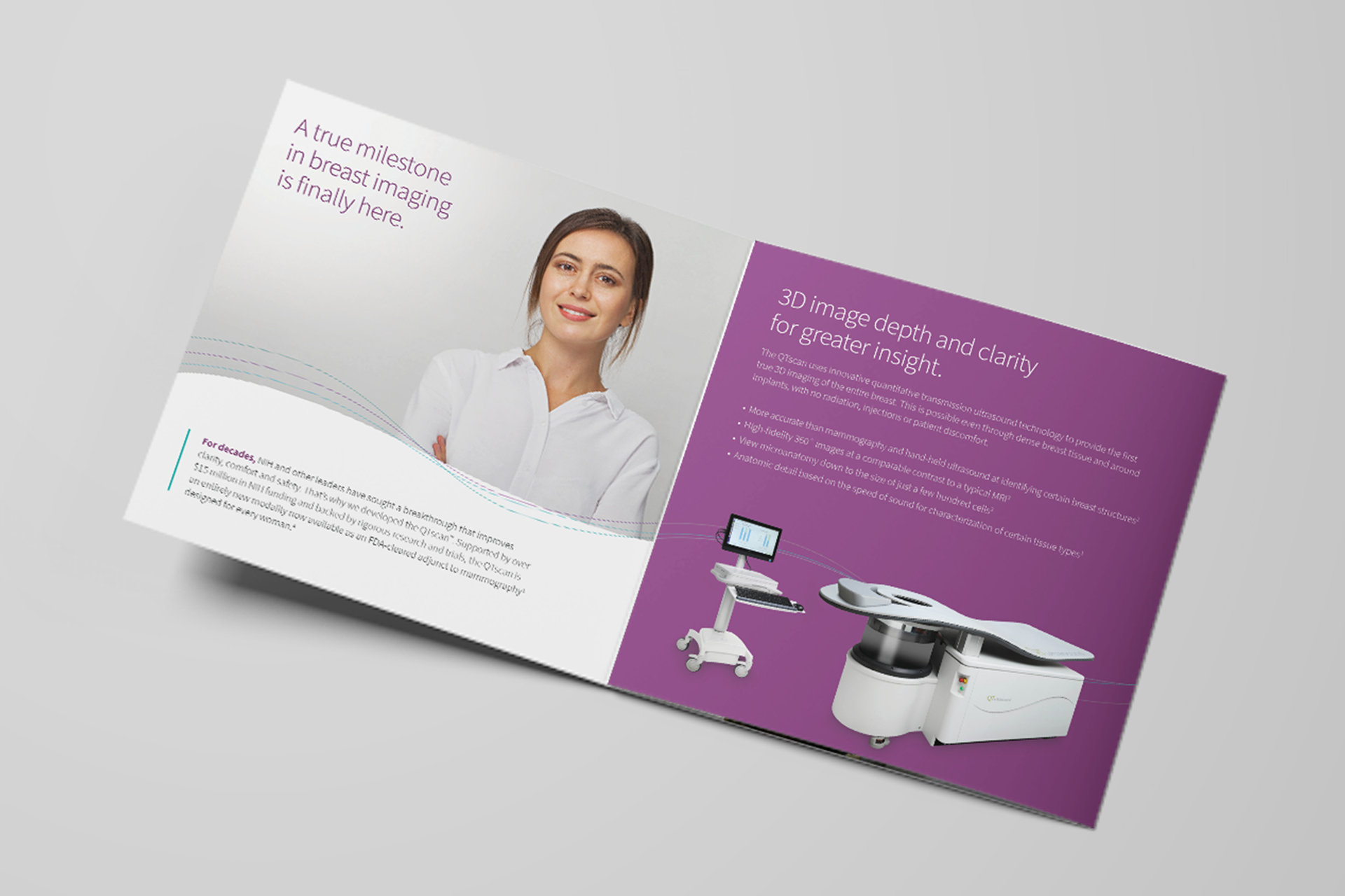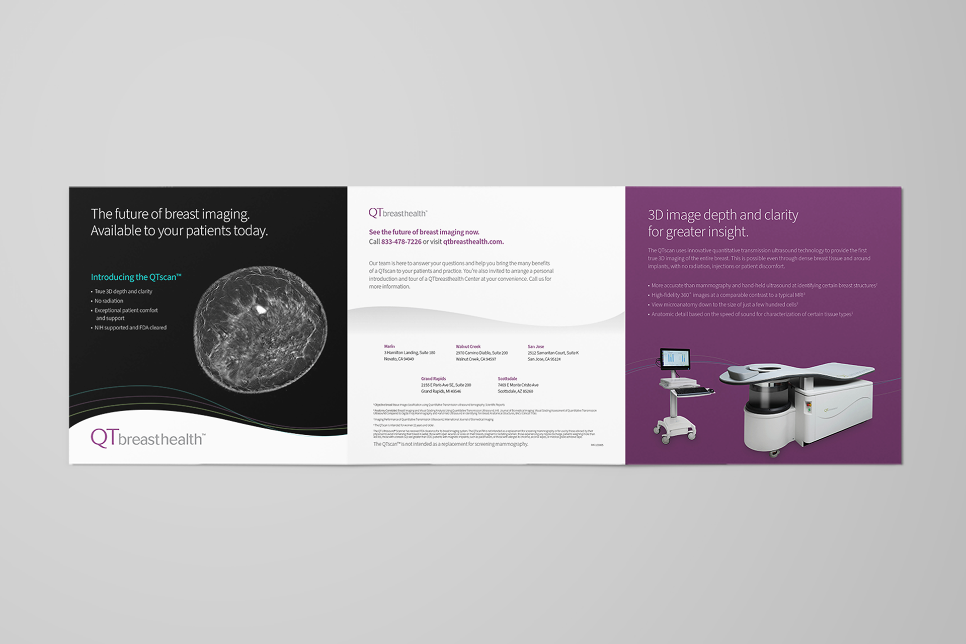Two trifold brochures were created for two distinct audiences. One focused on patients, highlighting the benefits of choosing QTbreasthealth’s services. The other targeted doctors and specialists, explaining the technology behind QTbreasthealth and how it works.